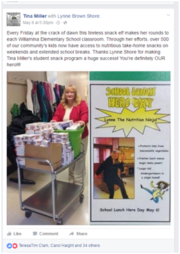 OREGON SCHOOL NUTRITION 'HEART CONNECTIONS' Lynne Shore ~ Director of Nutrition Services ~ Willamenia School District~ Willamenia, OR "Every Friday at the crack of dawn the tireless Nutritious SNACK ELF, Lynne Shore, makes her rounds to each Willamina Elementary School Classroom. Through her efforts, over 500 of Oregon's children now have access to nutritious take-home snacks on weekends and extended school breaks." Here's How Lynne Shore and Does IT: "The Tina Miller Teen Center and Betty Lou's Snack Company have donated to Willamina School District School Nutrition Services Betty Lou's Snack Balls for our students (93% are qualify for free and reduced meals) to take home to eat on the weekends and extended school breaks. I deliver them to the classroom before school starts every Friday morning. Instead of a backpack meal program this is how we provide healthy snacks for our students.